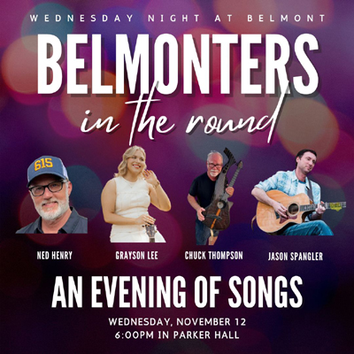 On Wednesday, November 12, make plans to join us at 6:00pm in Parker Hall for a special Wednesday Night at Belmont (WNAB) program, Belmonters in the Round: An Evening of Songs.