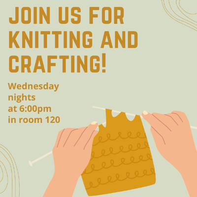 Beginning January 14, join us Wednesday nights at 6:00pm in the Library (room 120) for an evening of knitting, crafting, and good company!