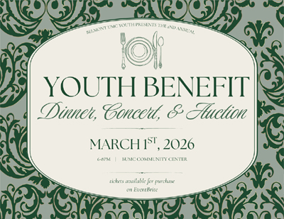 This year’s Youth Benefit Dinner, Concert, and Auction will be held in the Community Center on Sunday, March 1, from 6:00-8:00pm, so save the date! Join us for an evening of music, fellowship, dinner, and bidding on exciting auction items as we raise funds for our youth program’s summer trips.